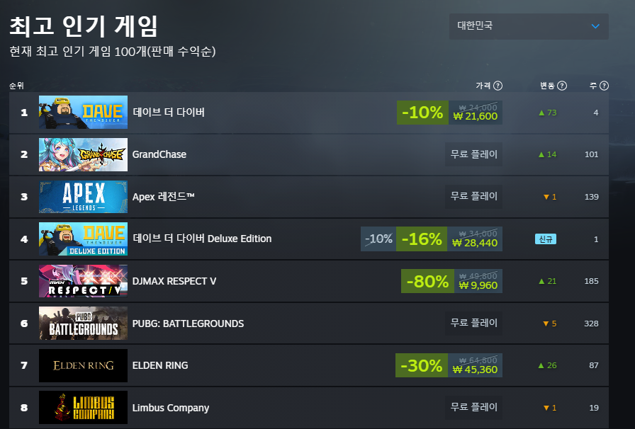스팀 여름 세일이 시작되고 쟁쟁한 대작들이 순위권에 오르고 배틀비트 리마스터가 2주 넘게 2위 아래로 내려가지 않던 가운데, 데이브 더 다이버가 이들을 제치고 1위에 올랐습니다. 최대 동시접속자 또한 6만 명을 넘어 나날이 경신 중인데요.