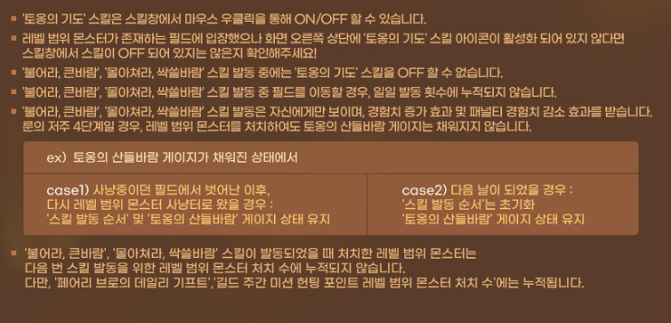 * 레벨 범위 몬스터가 등장하는 사냥터에 입장하면, '토옹의 기도' 스킬이 자동으로 활성화 됩니다.