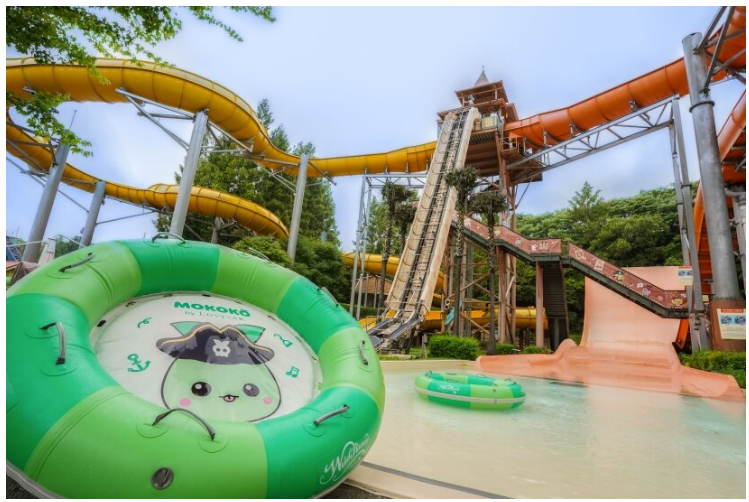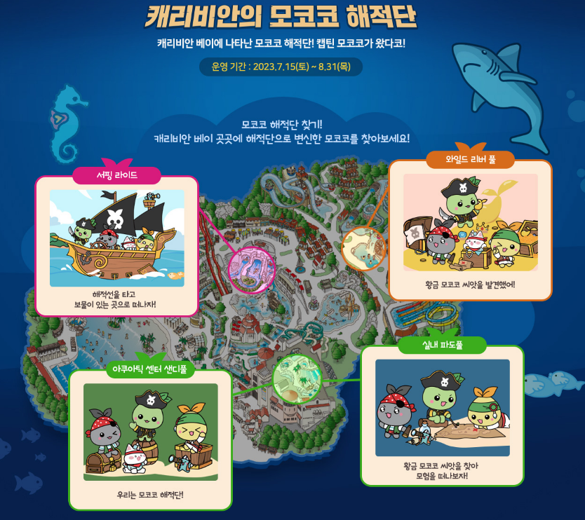 특히 아쿠아틱 센터, 실내 파도풀, 서핑 라이드, 와일드 리버풀 등 캐리비안 베이 주요 공간에는 캡틴 모코코와 모코코 해적단을 테마로 한 다양한 조형물과 포토존을 설치했습니다. 또, 대여용 타월도 컬래버레이션에 맞춘 특별 디자인으로 제공된다고 해요.