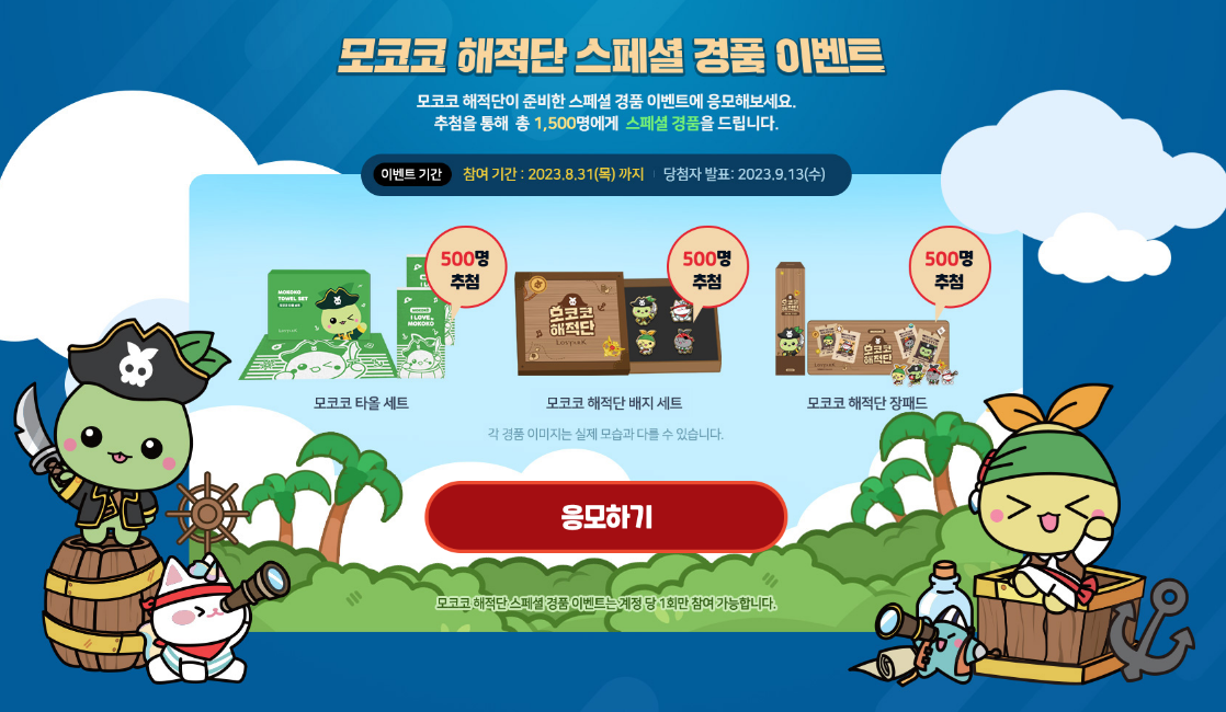 한편, 스마일게이트 RPG는 이번 컬래버를 기념해 모험가들에게 특별 굿즈 선물 이벤트를 진행한다고 합니다. 로스트아크 공식 홈페이지에서 모코코 해적단 스페셜 경품 이벤트에 응모하면 추첨을 통해 모코코 타월세트, 모코코 해적단 뱃지 세트, 모코코 해적단 장패드 등 다양한 굿즈가 총 1,500명에게 제공된다는 거!! (오호...)