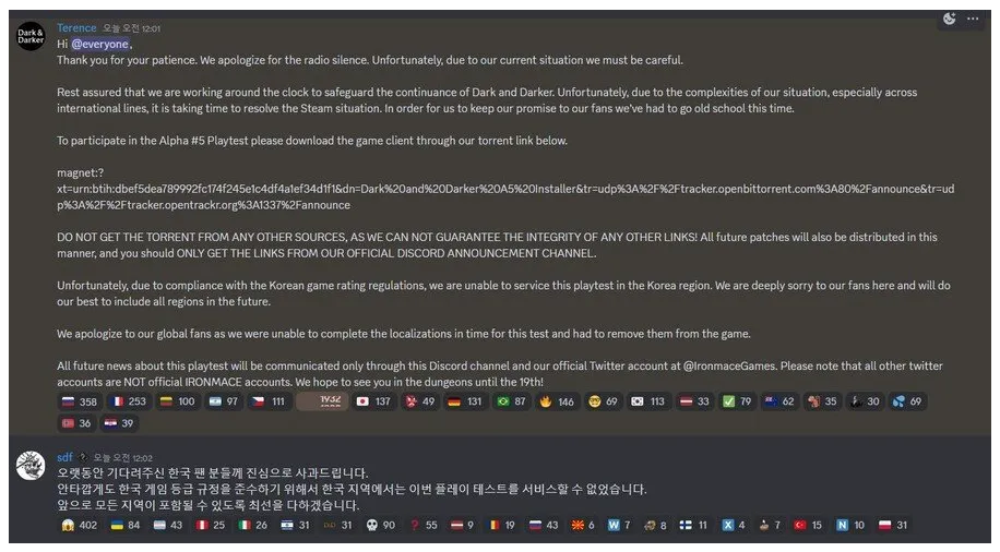 하지만 다크 앤 다커는 보란 듯이 토렌트를 통해 베타 테스트를 진행하고, 변호사를 선임할 돈이 필요하다며 유저들에게 펀딩을 요청해 몇 만 달러를 순식간에 모으기도 했죠...