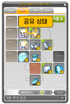 ■ 장비창(기본 단축키[E]) > 캐시 탭 하단에 3개의 프리셋 제공