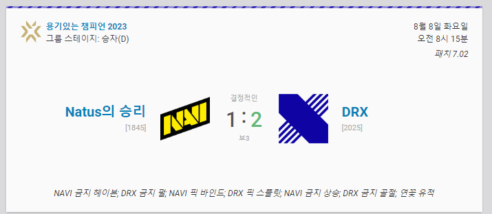 8일 오전 미국 캘리포니아주 로스앤젤레스에서 열린 '발로란트 2023 챔피언스 로스앤젤레스' 그룹 스테이지 D조 승자전에서 DRX가 나투스 빈체레 (이하 NAVI) 상대로 세트 스코어 2대 1 승리하면서 플레이오프 진출에 성공했는데요.