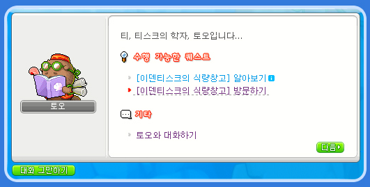 이벤트 알림이 또는 여름과 겨울의 섬에 위치한 NPC 토오를 통해 [이덴티스크의 식량창고] 새로운 식량창고 퀘스트를 수락해주세요.