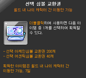 선택 심볼 교환권을 사용해 획득하는 아이템은 월드 내 나의 캐릭터 간 이동만 가능, 유효 기간 7일입니다.