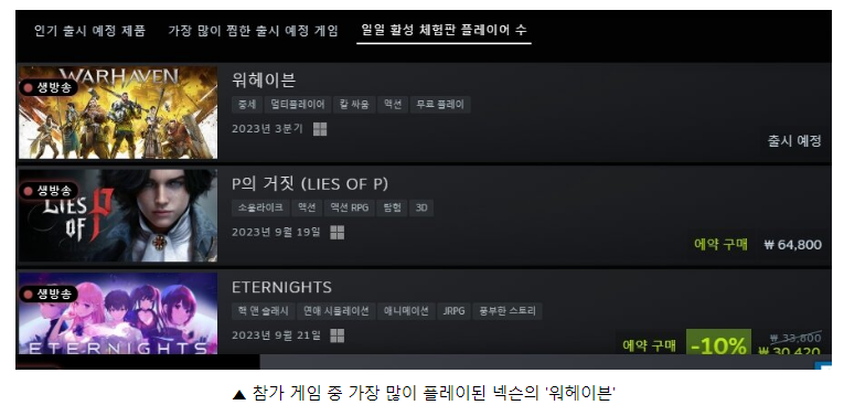 넥슨의 또 다른 신작 워헤이븐은 작년 10월 글로벌 베타 테스트 이후 세계 최대 전자 소프트웨어 유통망(ESD) 스팀에서 개최한 출시 예정작 공개 축제 '스팀 넥스트 페스트(SNF)'에 참가해 동시 접속자 수 1위를 기록할 정도로 많은 국내외 유저들의 관심을 받았답니다.