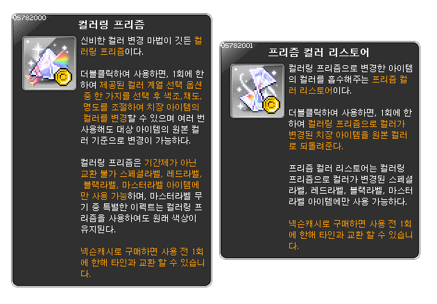 신규 아이템도 추가되었어요. 컬러링 프리즘은 치장 아이템의 색상을 변경할 수 있는 아이템으로, 로얄스타일 쿠폰과 마스터피스에서 얻을 수 있는 스페셜 라벨, 레드 라벨, 블랙 라벨, 마스터 라벨 아이템의 색조와 명조, 채도를 조절해 변경할 수 있어요. 가격은 29,900캐시로, 변경된 색상은 3,000캐시에 판매되는 프리즘 컬러 리스토어를 사용해 변경 전 색상으로 되돌릴 수 있답니다.