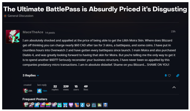 공식 포럼 내 '궁극의 배틀패스 가격은 터무니 없으며 스킨 배포 방식은 역겹다'라는 제목의 게시글은 벌써 339명이 동일한 견해를 보내며 지지할 정도로 뜨겁게 달아올랐어요. 게시 9시간 만에 핫 토픽으로 지정되었답니다.