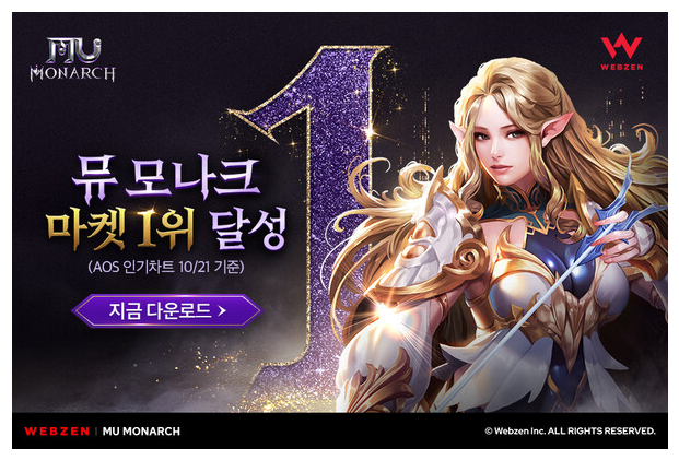 웹젠의 모바일 MMORPG 신작 뮤 모나크가 구글 플레이스토어 인기 1위를 기록했어요.