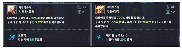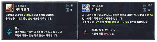 또한, 액티브 스킬 성공 시 근거리형 아군에게 5초 동안 치명타 확률 20% 증가 버프를 제공합니다. 따라서 치명타 확률 증가 버프를 가진 레이첼과 함께 사용하면 아군의 치명타 확률을 비약적으로 상승시킬 수 있답니다.
