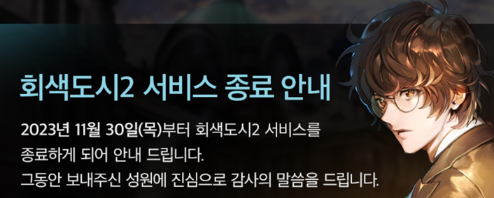 네시삼십삼분은 회색도시2 게임 내 공지를 통해 오는 11월 30일 게임 서비스를 종료한다고 발표했어요. 회색도시 2는 전작의 과거 이야기를 다루며 2014년 10월에 출시되어 매월 에피소드 하나를 출시하는 방식으로 서비스됐어요. 패키지게임과 에피소드 단위 판매 방식을 선택했고, 출시 후 약 1년 뒤인 2015년 2월에 완결편이 업데이트 되었어요.