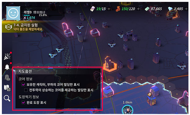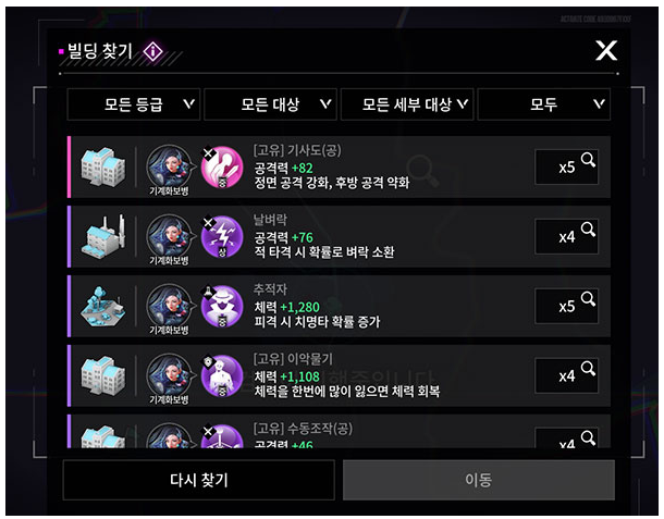 자신의 캐릭터나 부하에게 맞는 코어는 어떻게 찾을까요? 좌측의 지도 옵션에서 보유한 캐릭터, 부하의 코어 빌딩만 표시할 수 있습니다. 더 넓은 범위에 걸쳐 코어를 검색하려면 빌딩 찾기를 이용합시다. 목록에서 원하는 코어를 선택한 후 이동을 누르면 해당 코어를 획득할 수 있는 빌딩을 바로 알 수 있어요.