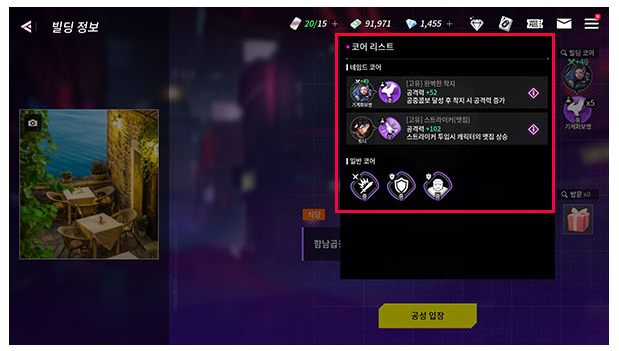 또한, 빌딩의 등급이 높을수록 더 높은 등급의 코어를 획득합니다. 처음부터 모든 빌딩 공성에는 도전할 수 없으며, 에픽 미션 진척도에 따라 레어, 유니크, 전설, 랜드마크 빌딩 공성에 참여할 수 있답니다.