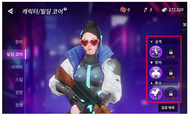 획득한 빌딩 코어는 캐릭터와 부하의 설정 화면에서 장착해야 효과가 적용됩니다. 캐릭터와 부하 모두 공격, 방어, 특수 부위에 맞는 코어를 장착해야 하며, 레벨 상승에 따라 잠긴 코어가 개방됩니다. 최대 장착 가능한 코어의 숫자는 6개입니다.