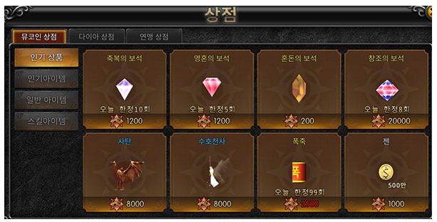 창조의 보석 또한 드랍율이 높지 않습니다. 드랍율이 정말 낮아 얻기 힘들다면 사냥에서 얻은 재료를 회수해 얻는 뮤코인을 사용해 상점에서 구매하는 방법도 있는데요. 창조의 보석은 개당 2만 뮤코인으로 상당히 비싸지만, 1차 날개로 얻는 효과가 크기에 충분히 구매 가치가 있습니다.