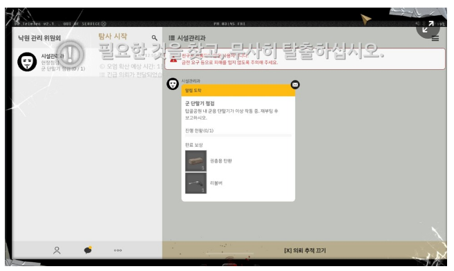 아이템 파밍을 마쳤다면 출구를 차아 도망쳐야 합니다. 탈출구는 게임시작부터 주어지는 개인 탈출구, 누구나 나갈 수 있지만, 일정 시간 뒤에 열리는 공용 탈출구, 지정된 스위치가 모두 켜지면 열리는 특수 탈출구로 나뉩니다.