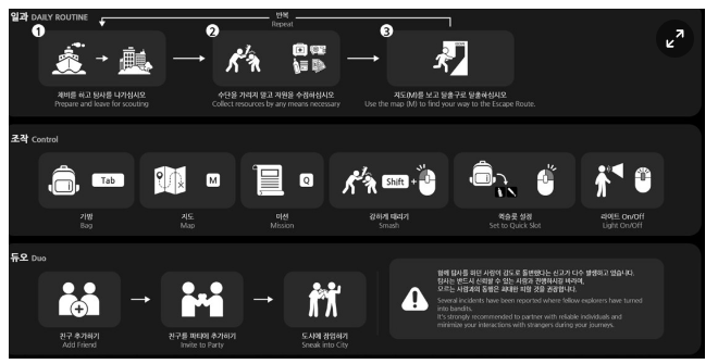 M을 눌러 맵을 확인하고 Q를 눌러 주어진 임무를 확인할 수 있습니다. 미니맵이 없으므로 지도를 보며 위치를 가늠하는 것이 중요합니다. 생존자 각 개인에게 주어진 태블릿은 지도와 임무를 확인하는 것 이외에도 탈출구에 접근하게 만드는 열쇠 역할을 합니다. 다른 생존자를 죽인 뒤 얻은 태블릿으로 다른 개인 탈출구를 이용할 수 있답니다.