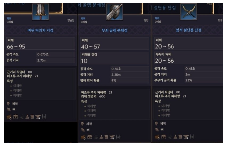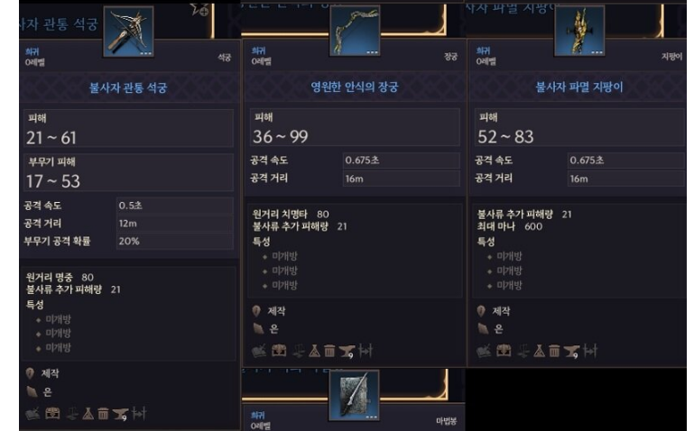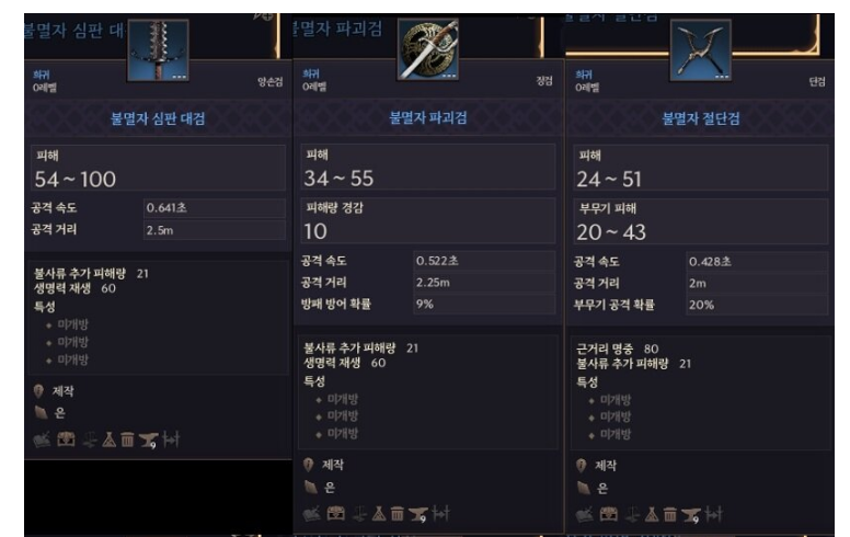 캐슬러 마을과 비엔타 마을을 돌아다니는 제작자는 불사류 대상에게 추가 피해를 주는 무기를 제작할 수 있습니다. 불사류는 실레우스의 심연과 실라베스 사원, 투라네 폐허 몬스터들입니다. 성소 발굴지와 사막 언덕을 돌아다니는 제작자는 피조류 대상으로 추가 피해를 주는 무기를 만들 수 있는데요. 피조류는 골렘류인데 성난 나무 황야 골렘들이 대표적입니다.