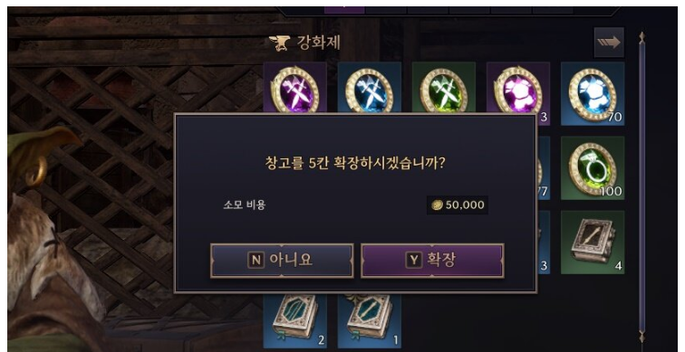 창고 슬롯은 처음에 20칸만 제공되고, 솔란트를 지불해 5칸씩 확장할 수 있습니다. 처음에는 가벼운 마음으로 창고를 확장할 수 있지만, 확장 횟수가 증가하면 점점 필요한 솔란트가 증가해 부담이 커집니다. 레벨업을 마친 뒤 다양한 장비 파밍을 진행하는 단계에서는 장비 제작과 성장에 소모하는 솔란트가 상당히 많기 때문에 창고 슬롯 확장은 신중하게 결정해야 합니다.