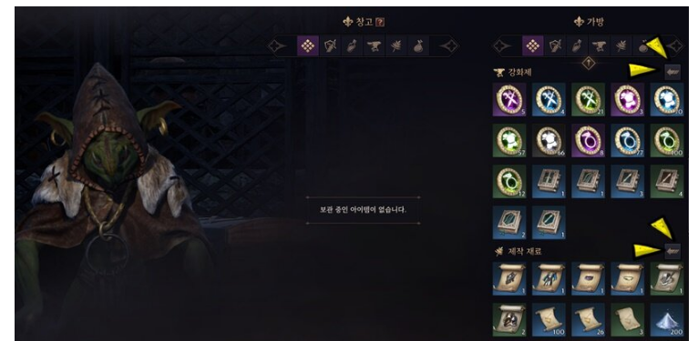 창고 관리인과 대화를 하면 가방 탭마다 왼쪽으로 향하는 화살표 아이콘을 볼 수 있는데요. 이는 해당 카테고리의 모든 아이템을 창고에 보관하는 기능입니다. 이를 활용해 창고에 있어도 사용 가능한 강화제와 제작 재료 카테고리 아이템을 모두 보관하면 사용 가능한 가방 슬롯이 대폭 증가합니다. 처음에는 우측 하단에 있는 빠른 보관 키가 가장 먼저 눈에 들어오지만, 이 버튼은 제작 재료만 일괄 보관되며 보관할 아이템 설정이 불가능한 점이 아쉽습니다.