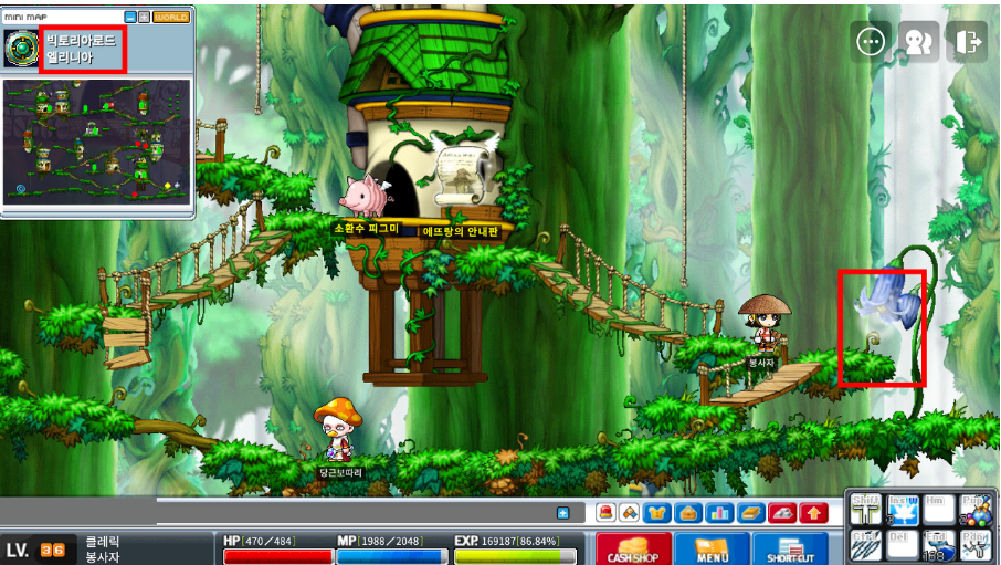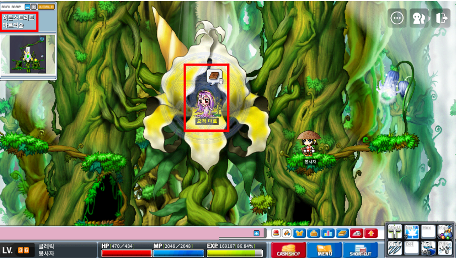 엘리니아 마을의 오른쪽 아래 파란색 꽃 근처에서 위 방향키를 눌러 '마르의숲'으로 진입하세요.