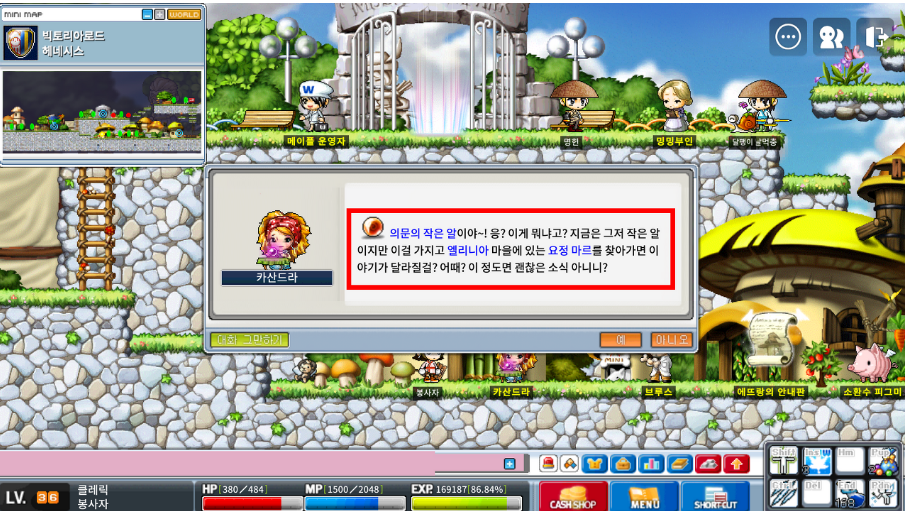 헤네시스의 NPC '카산드라' 찾기: 먼저, 헤네시스 마을로 가서 NPC 카산드라를 찾아야 해요.