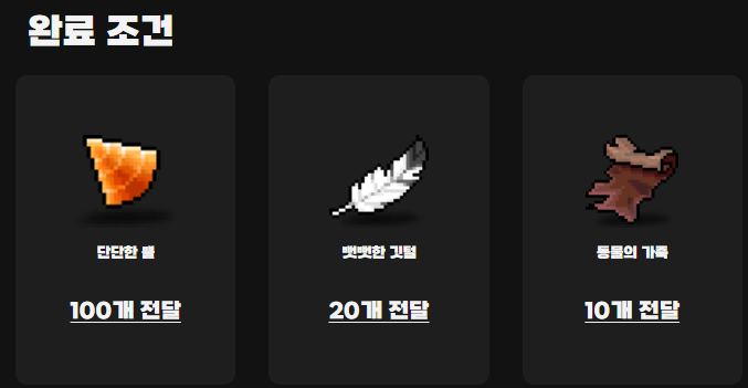 필요 재료: 뻣뻣한 깃털 20개, 단단한 뿔 100개, 동물의 가죽 10개