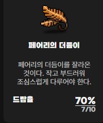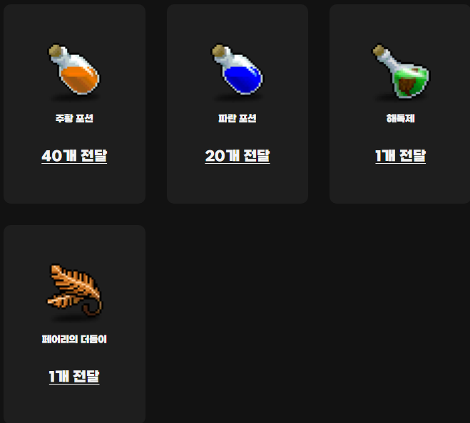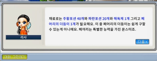 필요 재료: 주황포션 40개, 파란포션 20개, 해독제 1개, 페어리의 더듬이 1개