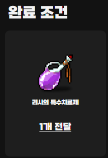 리사의 특수 치료제 2: 리사로부터 치료제 제조법을 듣고 필요한 재료를 모아 리사에게 전달하면 됩니다.