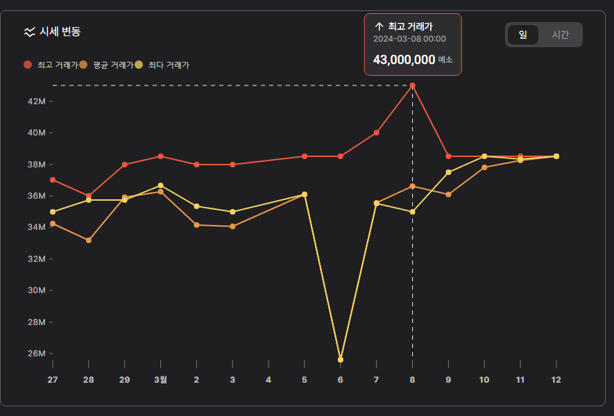 제가 확인한 '뇌전 수리검'의 경우, 평균 거래가격이 3600만 메소였어요. 판매자나 구매자 모두 이 가격을 기준으로 거래를 고려해 보세요.