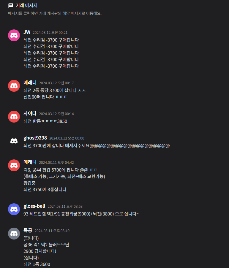 사이트를 조금만 내려보면, 실제 유저들의 판매 채팅 기록을 볼 수 있어요. 디스코드와 연동되어 있어 바로 소통도 가능합니다.