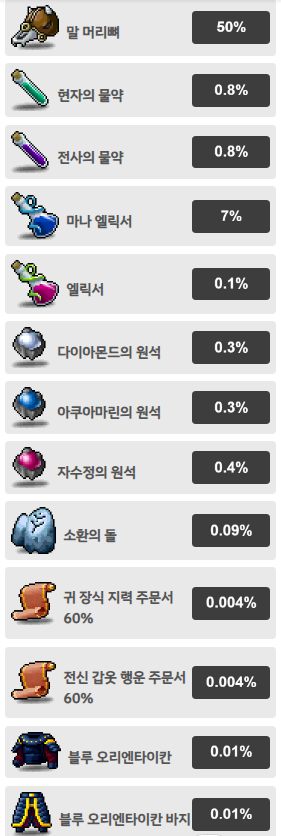 스켈레톤 지휘관을 쓰러뜨리면 다양한 보상을 얻을 수 있어요. 말 머리뼈, 현자의 물약, 전사의 물약, 마나 엘릭서, 엘릭서, 다이아몬드의 원석 등 다양한 아이템들이 드랍됩니다. 특히 블루 오리엔타이칸, 블러디 맨티스 등의 장비도 획득할 수 있어요.