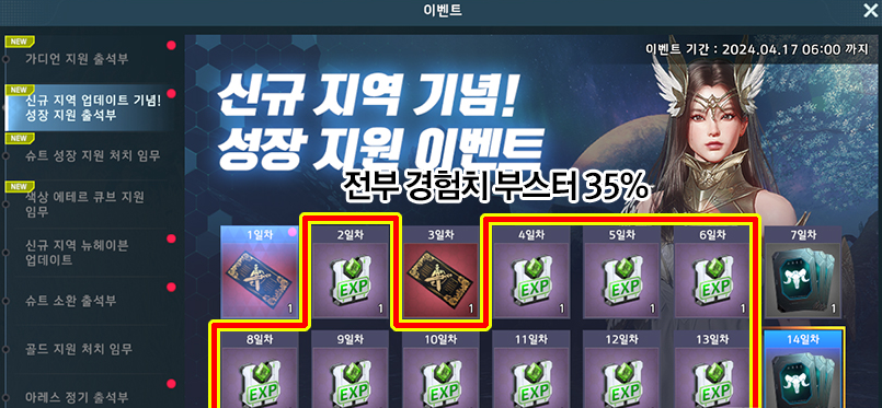 현재 접속 보상 이벤트가 2개 진행중입니다. 첫 번째는 '신규 지역 업데이트 기념! 성장 지원 이벤트'입니다.