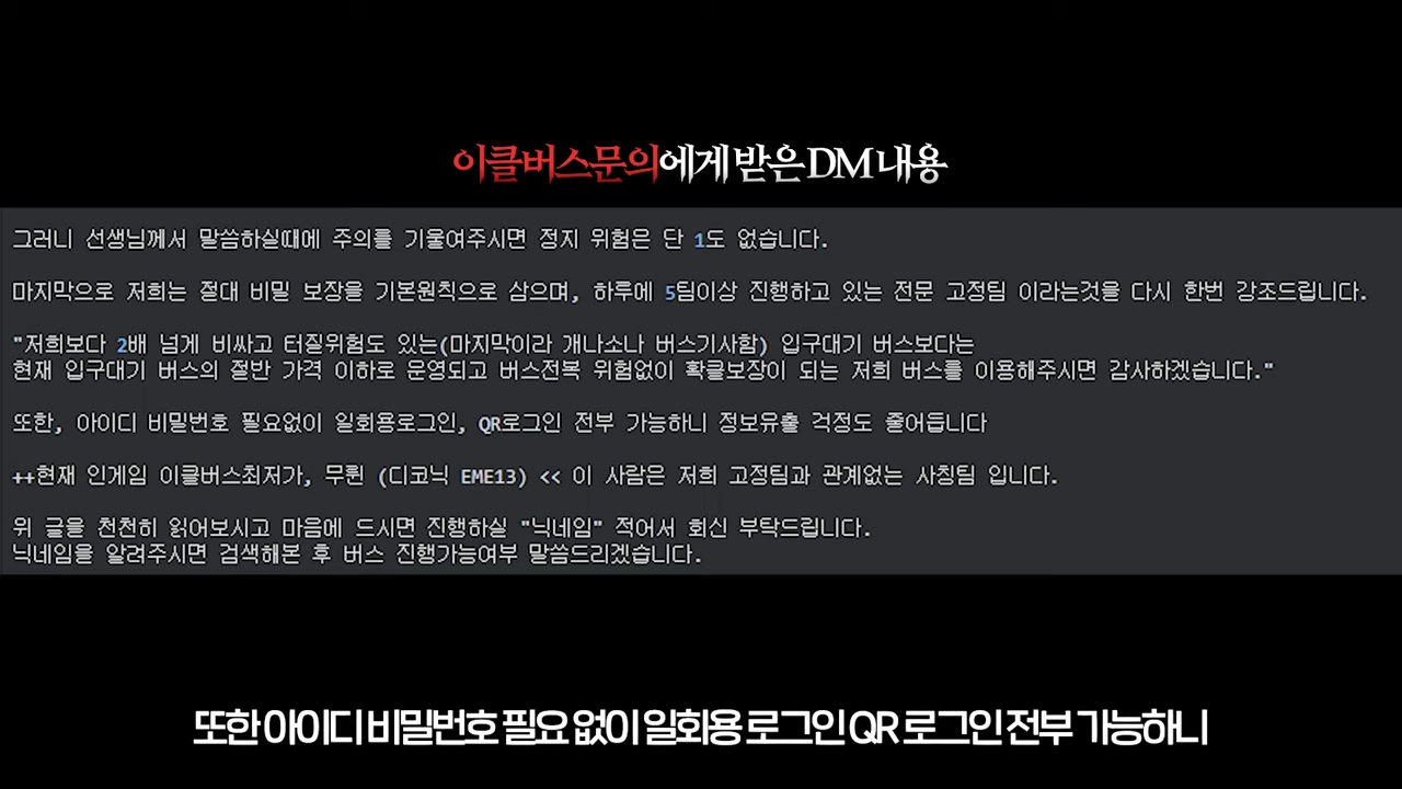 대리와 버스도 성행했습니다. 9일 1 관문 모집 방은 최저가라는 방에 문의를 넣으면 "8인 버스 기사팀이 손님 게정으로 플레이하며 버스를 돌린다"는 식으로 사실상 대리 행위를 유도하는 일이 많았습니다. 손님이 본인 계정으로 참여하는 버스 비용이 100만 골드라면, 대리 비용은 30만 골드 정도로 저렴합니다. 이는 해킹, 정지 등 대리 행위 자체의 위험성 때문인 것으로 보입니다.