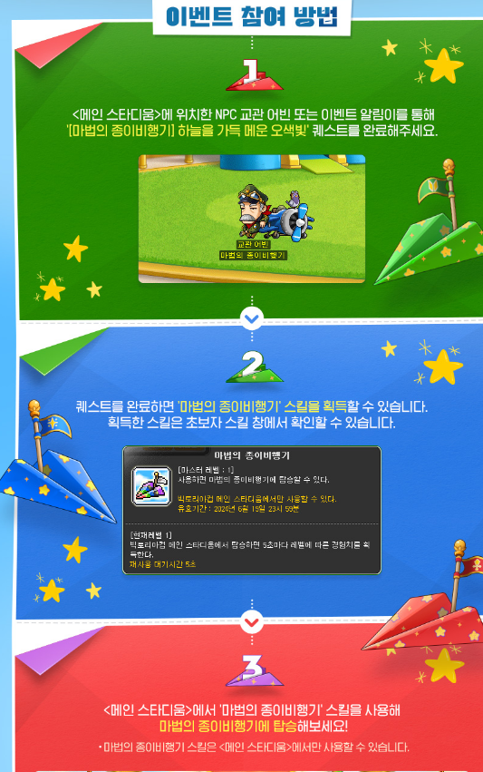 이벤트 참여 방법은 먼저 <메인 스타디움>에 위치한 NPC 교관 어빈 또는 이벤트 알림이를 통해 '[마법의 종이비행기] 하늘을 가득 메운 오색빛' 퀘스트를 완료합니다. 퀘스트를 완료하면 '마법의 종이비행기' 스킬을 획득할 수 있습니다. 획득한 스킬은 초보자 스킬 창에서 확인할 수 있습니다. <메인 스타디움>에서 '마법의 종이비행기' 스킬을 사용해 마법의 종이비행기에 탑승해 볼 수 있습니다.