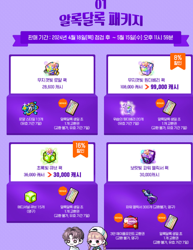알록달록 패키지를 판매 중입니다. <무지갯빛 로얄 팩>, <무지갯빛 원더베리 팩> 은 리부트 2 월드 포함 모든 월드에서 구매할 수 있으며, <초록빛 큐브 팩>, <보랏빛 파워 엘릭서 팩>은 일반 월드에서만 구매 가능합니다.