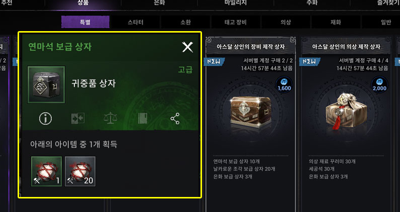 아스달 연대기에서 먼저 필수로 구매를 추천드리는 상품은 800 보석에 구매할 수 있는 아스달 상인의 장비 제작 상자입니다. 아스달 상인의 장비 제작 상자는 구매 시 연마석 보급 상자 10개, 날카로운 조각 보급 상자 20개, 은화 보급 상자 3개, 1,600 마일리지를 줍니다. 2번 모두 구매하면 확률상 수백 개의 연마석을 얻을 수 있습니다. 연마석은 무기, 방어구, 장신구 등을 제작하는 데 모두 필요해서 나중에 상급 장비를 제작하는 데 필요합니다. 연마석은 얻을 수 있는 수단이 적어서 항상 부족합니다. 하지만 해당 상품을 구매할 수 있다면 수월하게 얻을 수 있습니다.