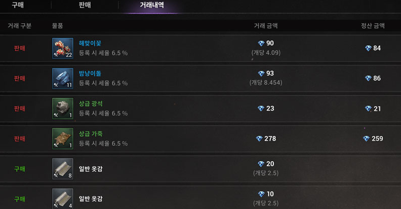보석 획득은 거래소를 적극적으로 활용하면 좋습니다. 아스달 연대기의 콘텐츠와 사냥, 그리고 제작 등을 진행하다 보면 아이템 가운데 거래가 가능한 종류가 나옵니다. 이러한 아이템은 모두 거래소에 등록하는 게 가능합니다. 특히, 현재 기준 희귀 무기, 방어구, 장신구를 제작하려는 유저가 많아서 필요한 재료는 모두 거래소에서 활발하게 거래되고 있습니다.