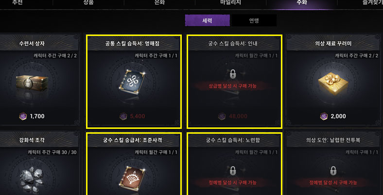 세력과 연맹 주화 상점에서는 스킬 습득서를 구매하시는 게 좋습니다. 공통과 직업 전용 스킬 습득서를 구매할 수 있고, 모두 효율적인 능력을 가지고 있습니다. 이 외에는 부족한 제작 재료를 구매하는데 쓸 수 있는 장인 주화 주머니를 추천드립니다.