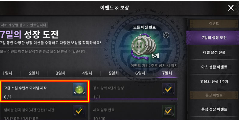 7일의 성장 도전 이벤트는 부캐릭터로 진행하는 게 좋습니다. 7일의 성장 도전 이벤트는 본캐릭터와 부캐릭터가 현황을 공유합니다. 이 때문에 본캐릭터로 하기 까다로운 미션은 부캐릭터로 하는 게 좋습니다. 대표적으로 5일 차 고급 옷감 아이템 제작, 6일 차 공명석 제작, 7일 차 고급 스킬 수련서 아이템 제작 등이 있습니다. 부캐릭터를 30까지 육성하다 보면 각 미션 수행을 위한 재료를 쉽게 얻을 수 있으니 이를 통해 완료하시면 됩니다. 보상 수령은 본캐릭터로 하셔야 합니다.