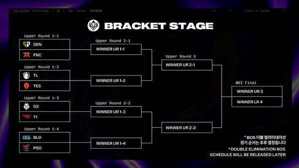 플레이-인 스테이지를 무실 세트로 통과한 T1의 상대는 LEC 1번 시드 G2 이스포츠로 정해졌습니다. G2 이스포츠는 2019년 MSI에서 T1을 4강에서 이긴 바 있습니다. T1이 G2 이스포츠를 꺾는다고 하더라도 LPL 1번 시드인 빌리빌리 게이밍과 상위조 2라운드에서 대결할 가능성이 크기 때문에 쉽지 않은 일정을 소화해야 합니다. T1은 5월 10일 오후 6시에 G2를 만납니다. 5전 3선승제 더블 엘리미네이션 방식으로 진행되는 MSI 2024 브래킷 스테이지는 5월 7일부터 진행되며 대망의 결승전은 5월 19일 펼쳐집니다.