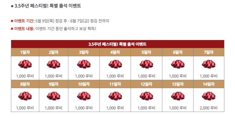 세븐나이츠2 3.5주년 기념 특별 출석 이벤트입니다. 이벤트 기간 동안 출석을 하면 루비를 지급해준다고 합니다.