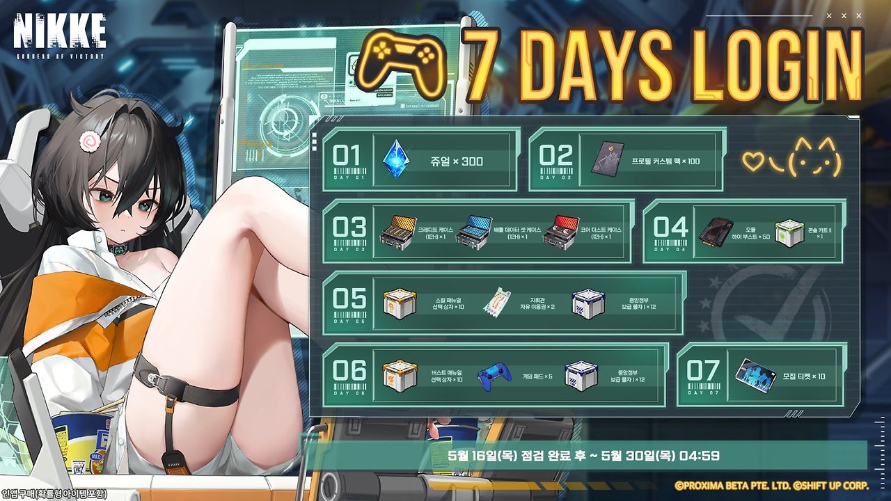 승리의 여신 니케 트로니 업데이트 기념 7일 출석 이벤트입니다. 이벤트 진행 기간 동안 매일 게임에 접속하면 최대 7일까지 보상을 받을 수 있습니다. 7일 누적 로그인 시 모집 티켓, 육성 재화 등 다양한 보상을 획득할 수 있습니다. 이벤트 진행 기간은 2024년 5월 16일(목) 점검 완료 후 ~ 5월 30일(목) 4:59:59입니다.