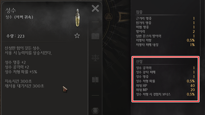 성수는 공격력, 명중 2를 획득할 수 있는 아이템입니다. 야채 꼬치와의 다른 점은 방어력+2, 감소+1 대신 처형 확률 5%가 붙어있습니다. 분당 골드 효율은 360 골드로 가장 비싼편에 속하나, 야채 꼬치와 함께 공격, 명중을 보정하는 가장 직접적인 공격 버프 아이템입니다. 또, 신성 스티그마를 각인하면 성수 효과를 강화할 수 있는 점도 중요합니다.