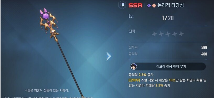 이보라의 전용 무기는 '논리적 타당성'입니다. 논리적 타당성은 장착 시 기본적으로 이보라의 공격력이 상승하며, 강화부에 적중된 대상에게 10초간 받는 치명타 확률 및 피해량이 증가하는 효과가 부여됩니다. 전용무기가 없다면 강철 활을 추천드립니다.