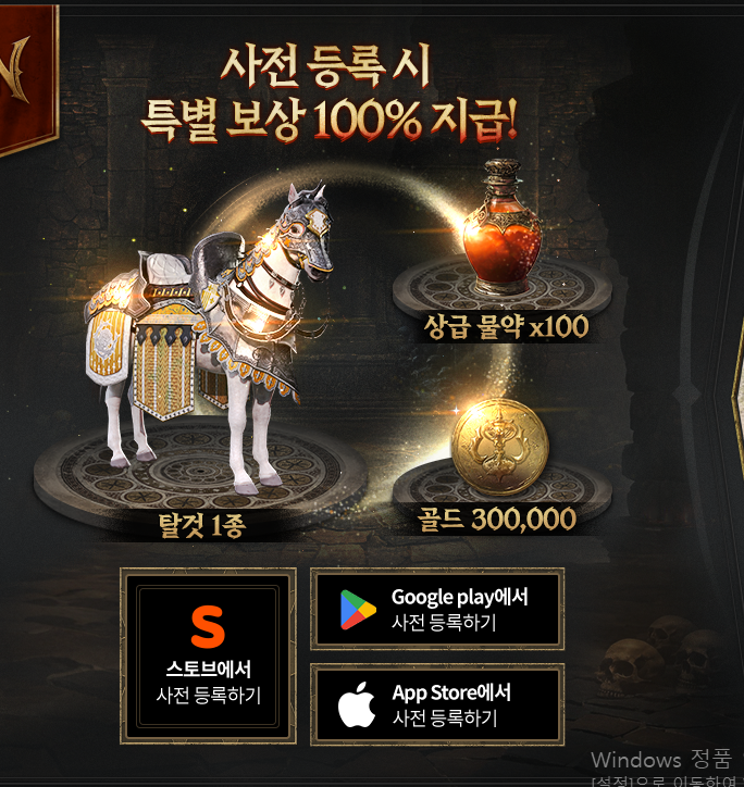 사전예약은 스토브, 구글 플레이, 앱스토어에서 가능합니다. 사전예약 보상으로는 탈것 1종, 상급 물약 x 100, 골드 300,000이 있습니다.