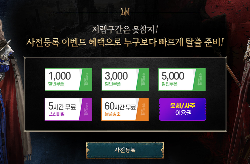 아래에 있는 배너를 클릭하시면 로드나인 사전등록 이벤트 페이지로 이동할 수 있습니다. 사전등록 이벤트 혜택으로는 할인쿠폰등을 지급해 줍니다.