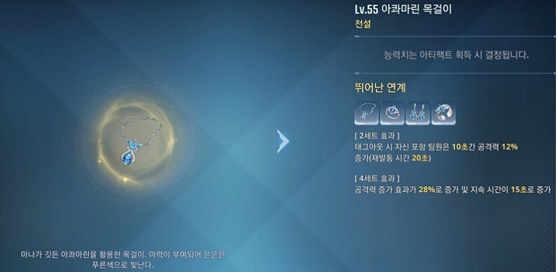 메이린 장신구 아티팩트는 서포터 헌터 국룰인 아콰마린을 선택하시면 됩니다. 아콰마린은 태그 아웃 시 팀원의 공격력을 증가시키기 때문에 메이린 뒤에 등장하는 아군 딜러의 공격 효율을 높일 수 있습니다.
