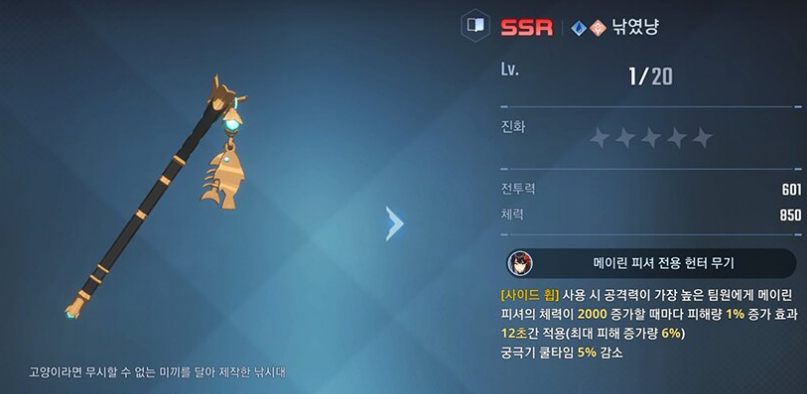 메이린의 전용 무기 '낚였냥'은 궁극기 쿨타임 감소와 함께, 메이린이 코어 공격 시 팀 내 공격력 최고 캐릭터에게 체력 증가에 따른 피해량 증가 효과를 부여합니다. 무기가 진화하면 효과가 강화되지만, 이를 위해 더 높은 체력이 필요합니다. 대안으로는 '고대 마도서'와 '강철 지팡이' 같은 헌터 SR 무기가 궁극기 사용을 잘 지원합니다.