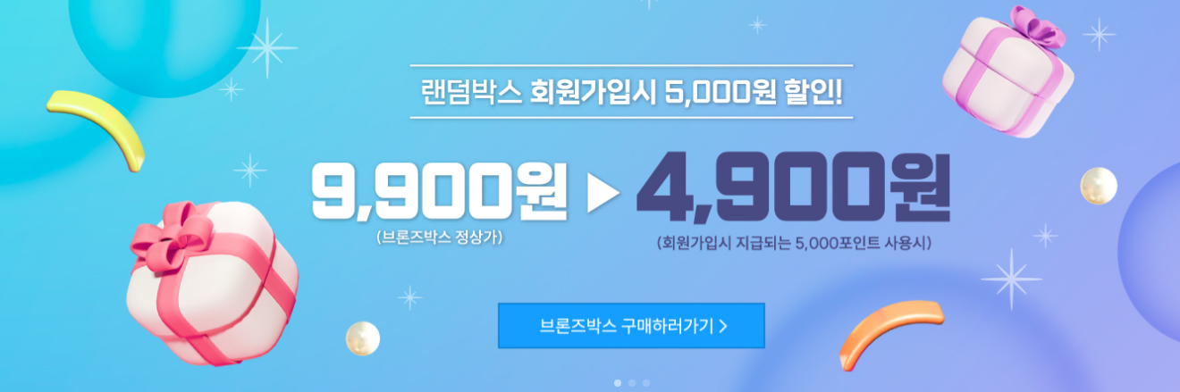 랜덤박스 회원가입 시 5000원이 즉시 할인됩니다. 예를 들어 브론즈박스 정상가가 9,900원인데 4,900원으로 5000원 할인된 가격에 구매가 가능합니다. 이곳에서 판매하는 랜덤박스는 최소 구매가 이상의 상품을 보장하는 랜덤박스라서 꽝없는 아주 좋은 랜덤박스입니다.